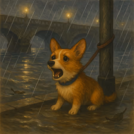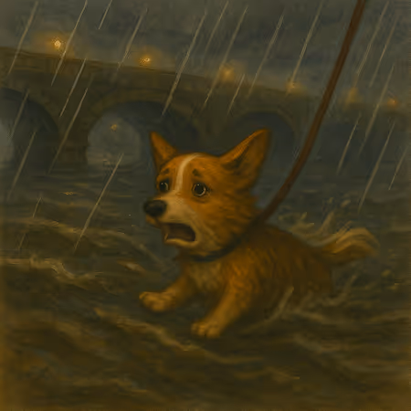 By the bridge, Cleo’s leash cinched to a post while the river swelled. She dug claws into mud and yelped whenever water surged.